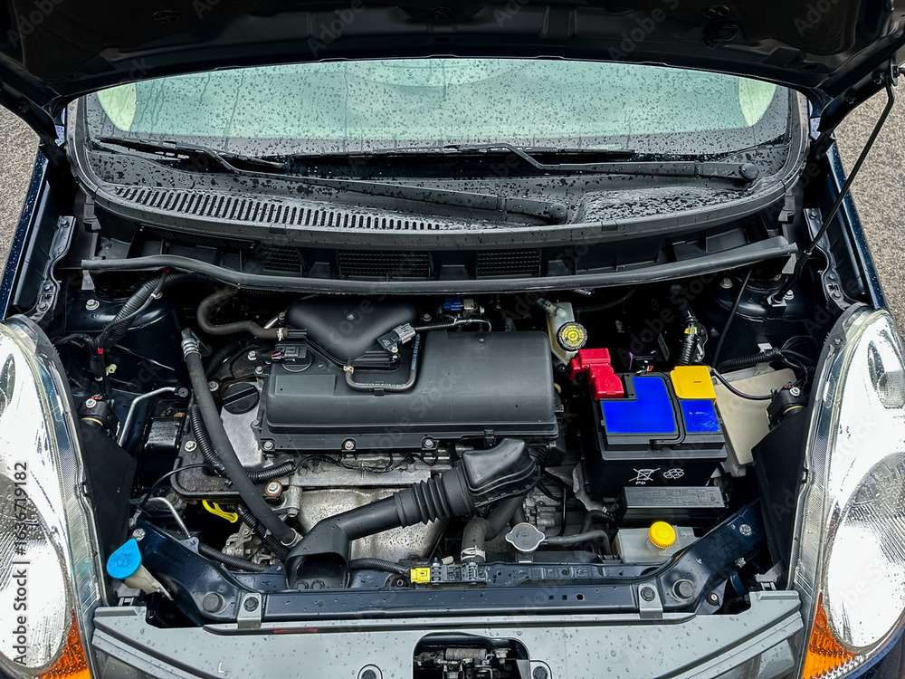 A CloseUp of a Car Engine Featuring Its Battery and Various Components, All Set Against a Rainy Environment This Detailed View is Ideal for Automotive Enthusiasts and Professional Mechanics