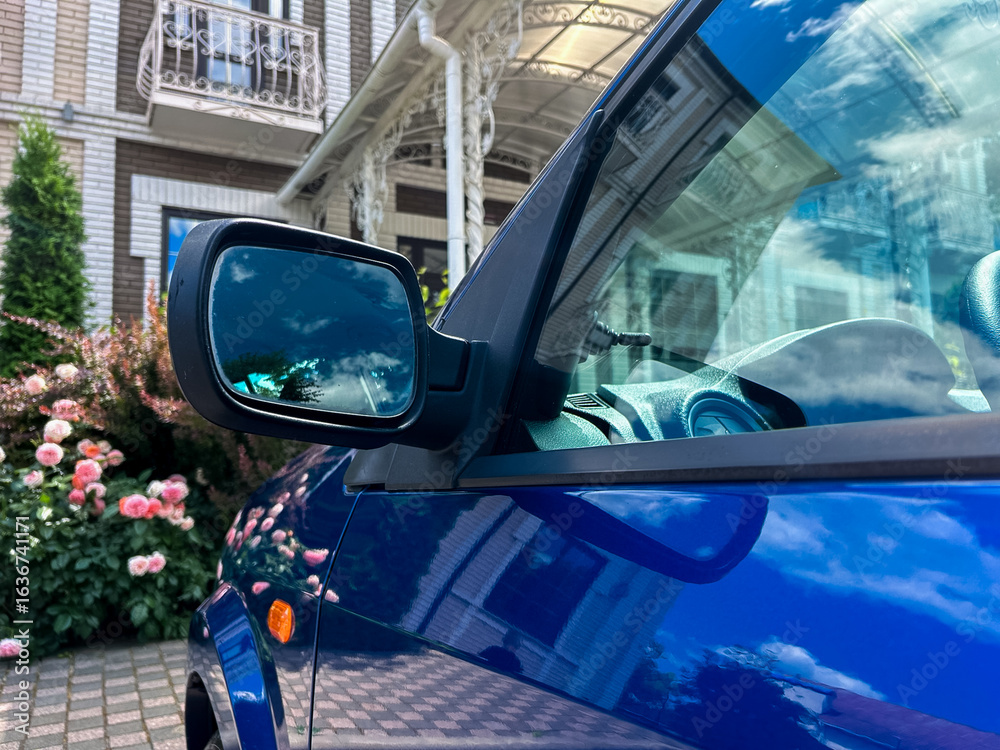 A stunning shiny blue car with a highly reflective side mirror is prominently displayed in a beautiful and blooming garden, surrounded by vibrant flowers, creating a picturesque and serene atmosphere