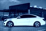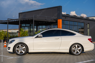 A beautifully designed sleek white luxury car is parked stylishly next to stunning modern architecture in the bright daylight, showcasing a perfect blend of elegance and contemporary aesthetics