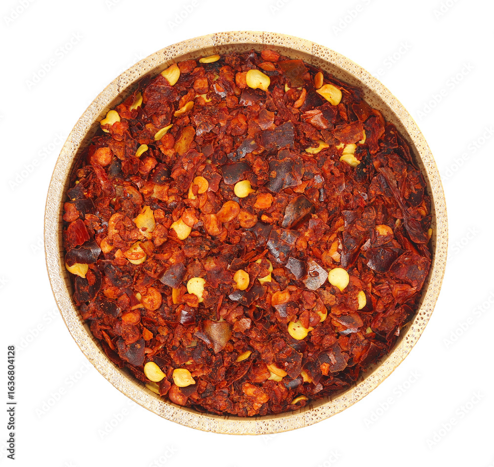 Spicy chili red pepper flakes, chopped, milled dry paprika pile in bamboo bowl isolated on white, top view, clipping path