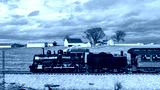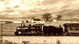 A vintage steam locomotive moves along railroad tracks across a scenic rural area. The backdrop features expansive fields and distant barns under cloudy skies, evoking a sense of nostalgia.
