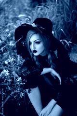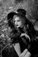 A young woman with long gray hair sits gracefully among colorful wildflowers
