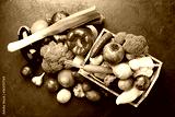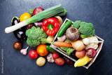 Wooden box with autumn harvest farm vegetables and root crops on black kitchen table top view. Healthy and organic food.