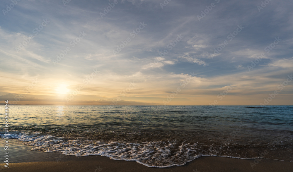 Sunset sky clouds over sea water background in evening with orange, blue sun light, Horizon beach sand sea ocean sunrise sky landscape nature backgrounds and gold sun down golden hour summer, Dusk sky