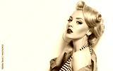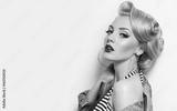 Beautiful young american girl in retro style, pinup. Blond, hairstyle - light curls. Retro make-up - red lips, black arrows. Clothing - jeans jacket and gold jewelry.