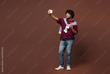 Full body young Indian man wear purple t-shirt sweatshirt tied over shoulders casual clothes doing selfie shot on mobile cell phone show v-sign isolated on plain brown background. Lifestyle concept.