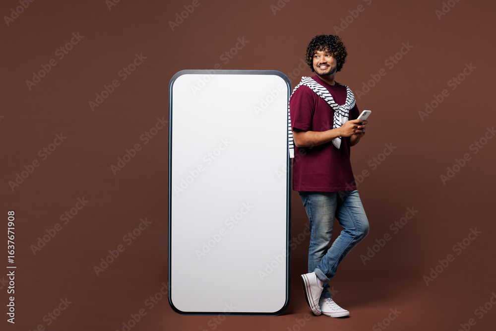 Full body side view young happy Indian man he wear purple t-shirt tied sweatshirt casual clothes big huge blank screen mobile cell phone with area using smartphone isolated on plain brown background.