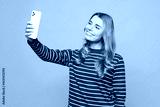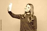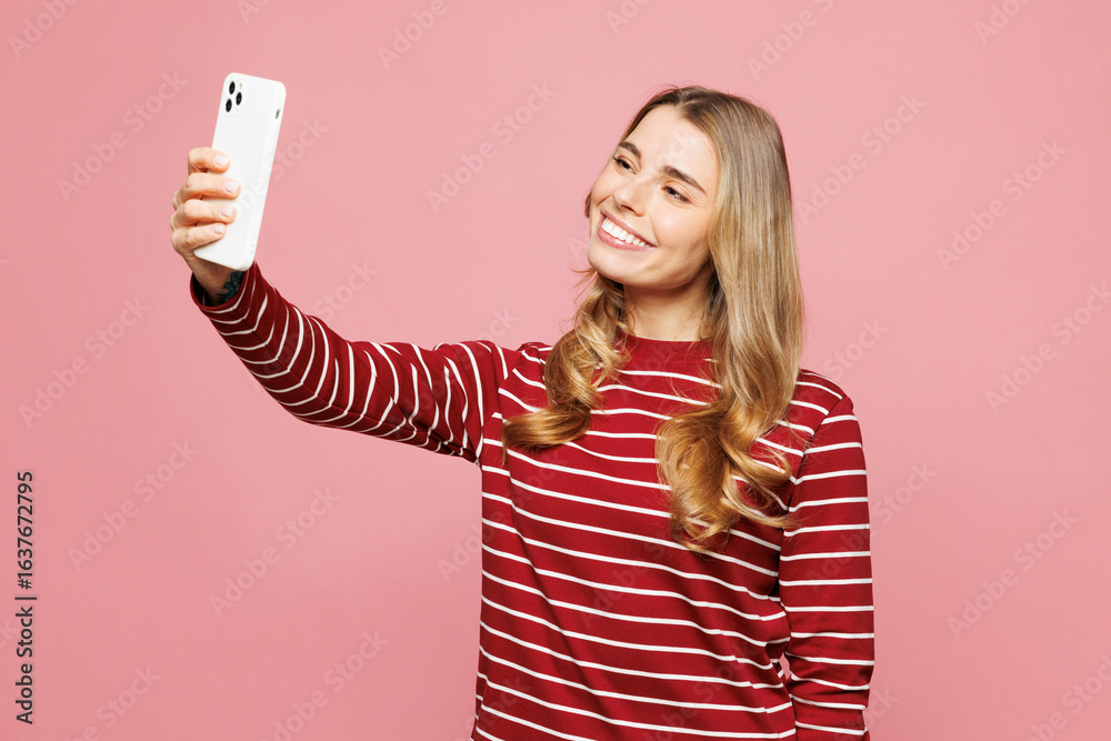 Young woman wearing red striped sweatshirt casual clothes doing selfie shot on mobile cell phone post photo on social network isolated on plain pastel light pink background studio. Lifestyle concept.