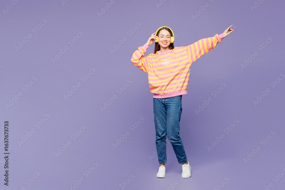 Full body young happy woman she wears yellow sweatshirt casual clothes listen to music in headphones raise up hand isolated on plain pastel light purple background studio portrait. Lifestyle concept.