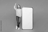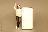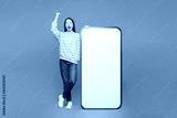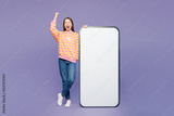 Full body young happy woman wear yellow sweatshirt casual clothes big huge blank screen mobile cell phone smartphone with area do winner gesture isolated on plain purple background. Lifestyle concept