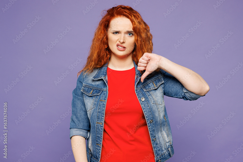 Young sad dissatisfied ginger woman she wear red t-shirt denim shirt showing thumb down dislike gesture look camera isolated on plain pastel light purple background studio portrait. Lifestyle concept