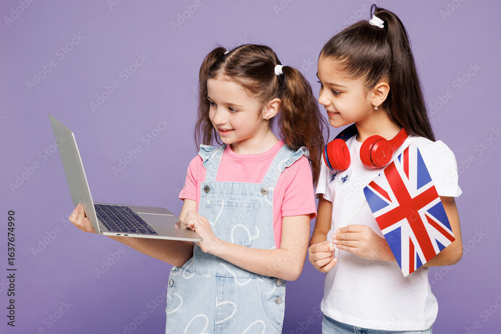 Little two friends kids children IT girls 9-10 years old wearing casual clothes together hold British flag use laptop pc computer learn English isolated on plain purple background. Lifestyle concept.