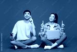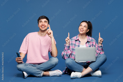 Full body young couple two friend family man woman wear pink casual clothes together sit use mobile cell phone hold work on laptop pc computer point finger overhead isolated on plain blue background.