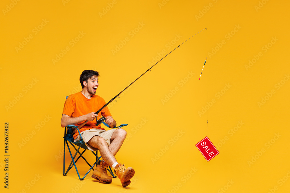 Full body young happy traveler man sit in chair hold fishing rod with sale isolated on plain yellow background. Tourist leads active lifestyle walk on spare time. Hiking trek rest travel trip concept.