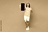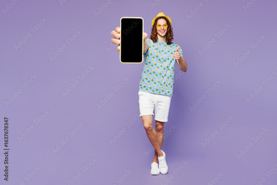 Full body young man wear blue beach t-shirt hat sunglasses rest near hotel pool hold use blank screen area mobile cell phone isolated on plain purple background. Summer vacation sea sun tan concept.