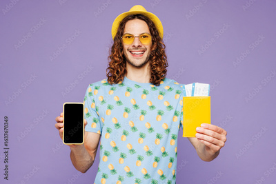 Traveler man rest near hotel pool hold passport ticket isolated on plain pastel purple background Tourist travel in free time rest getaway Air flight trip journey, summer vacation sea sun tan concept