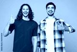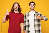 Young smiling happy satisfied two friends buddies men they wearing casual clothes together showing thumb up like gesture isolated on plain yellow orange background studio portrait. Lifestyle concept.