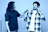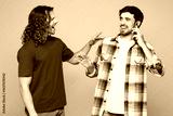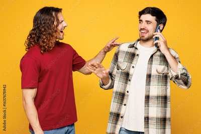 Young indignant jealous two friends buddies men wear casual clothes together talk speak on mobile cell phone disturbing isolated on plain yellow orange background studio portrait. Lifestyle concept.