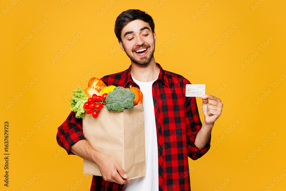 Young smiling man he wear casual clothes hold craft paper bag for takeaway mock up with food products, credit bank card isolated on plain yellow orange background. Delivery service from shop concept.