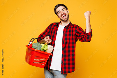 Young smiling happy man he wear casual clothes hold basket bag for takeaway mock up with food products do winner gesture isolated on plain yellow orange background. Delivery service from shop concept.