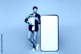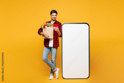 Full body young man in casual clothes hold bag for takeaway with food products big blank screen mobile cell phone use smartphone isolated on plain yellow background Delivery service from shop concept