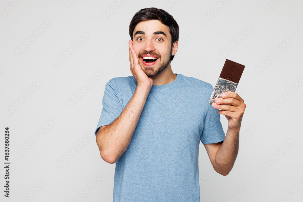 Young shocked surprised man wear blue t-shirt casual clothes hold eat chocolate bar put hand on face isolated on plain solid white background. Proper nutrition healthy food unhealthy choice concept.