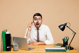 Young shocked successful employee business man wear white shirt tie sit work at office desk with pc laptop look through magnifier loupe isolated on plain beige background. Achievement career concept.