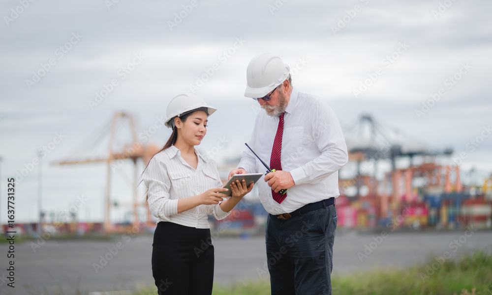 Secretary and engineering manager at industry port site inspection and maintaining large cranes and stacked cargo containers setting shipping port or import export logistics.