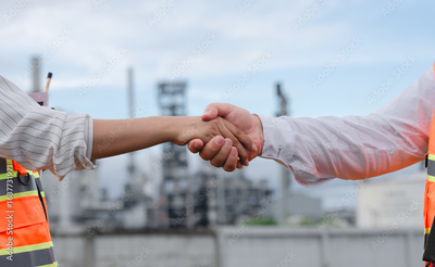Engineering manager and a secretary are seen conducting a site inspection at an industrial facility, likely a refinery or power plant.