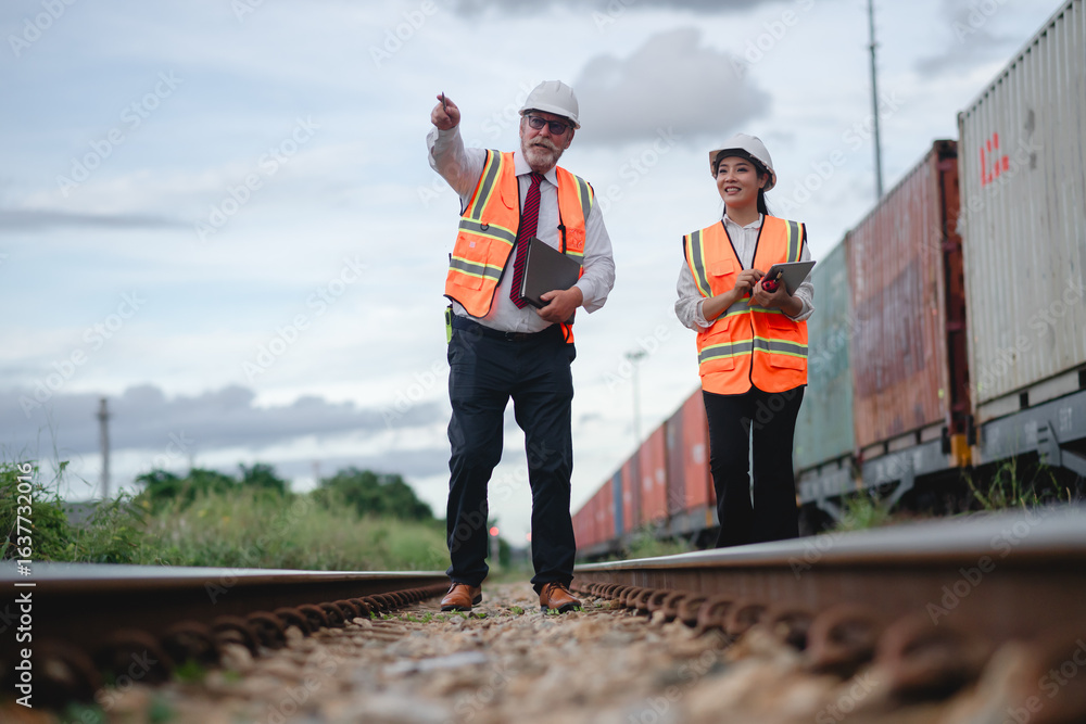 Engineer manager and a secretary working together railway track during inspection or routine maintenance container industrial or transportation setting the rail train import export logistics