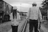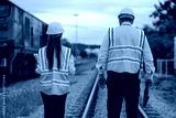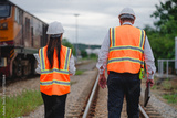 Engineer manager and a secretary working together railway track during inspection or routine maintenance container industrial or transportation setting the rail train import export logistics