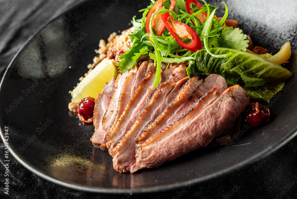 Seared duck breast with greens, chili, lemon, nuts, and berries on a black plate. Gourmet presentation with vibrant, fresh ingredients.