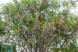 Colorful tree branches adorned with long, thin seed pods in a lush, green park during late spring