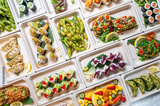 Vibrant horizontal photo of an abundant oriental banquet with natural light. Includes sushi with salmon, avocado, edamame, gyoza, avocado toast, seaweed salad, and mango-topped pancakes.