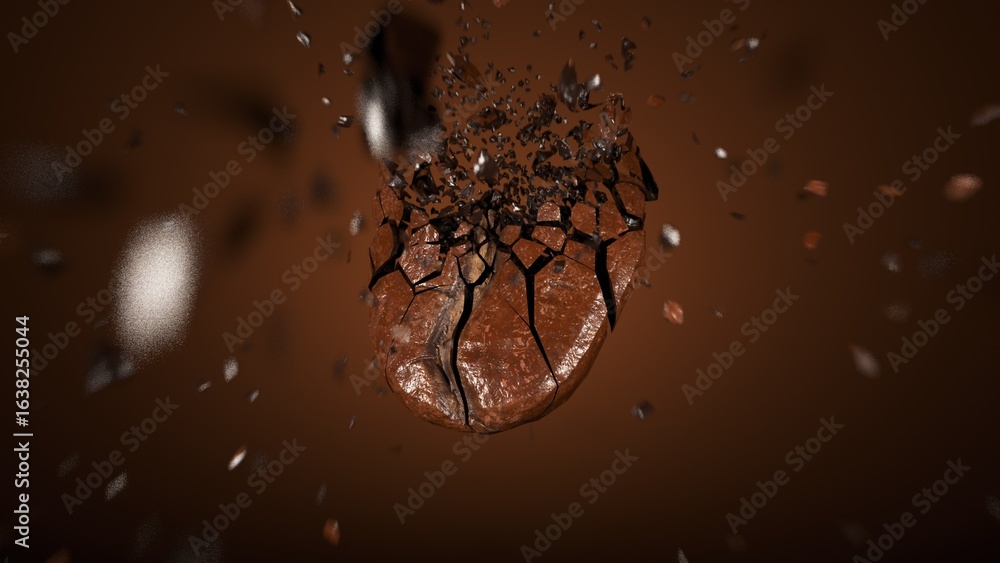 Coffee bean is shown in mid air, dramatically cracking and shattering into pieces against rich brown background, symbolizing energy and intensity