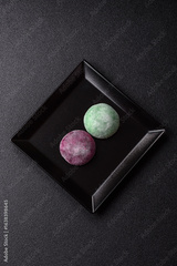 Japanese mochi, ice cream or Asian sweets with fruit filling. Mochi of different colors