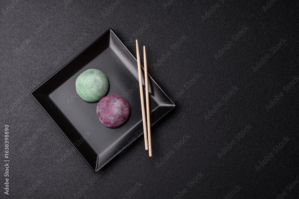 Japanese mochi, ice cream or Asian sweets with fruit filling. Mochi of different colors