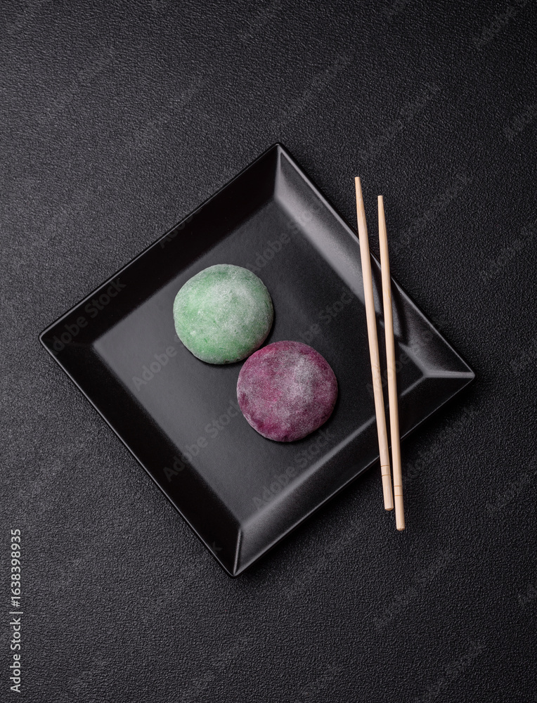 Japanese mochi, ice cream or Asian sweets with fruit filling. Mochi of different colors