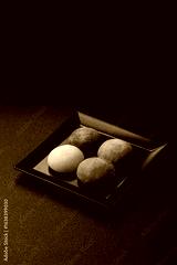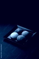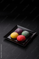 Japanese mochi, ice cream or Asian sweets with fruit filling. Mochi of different colors