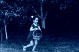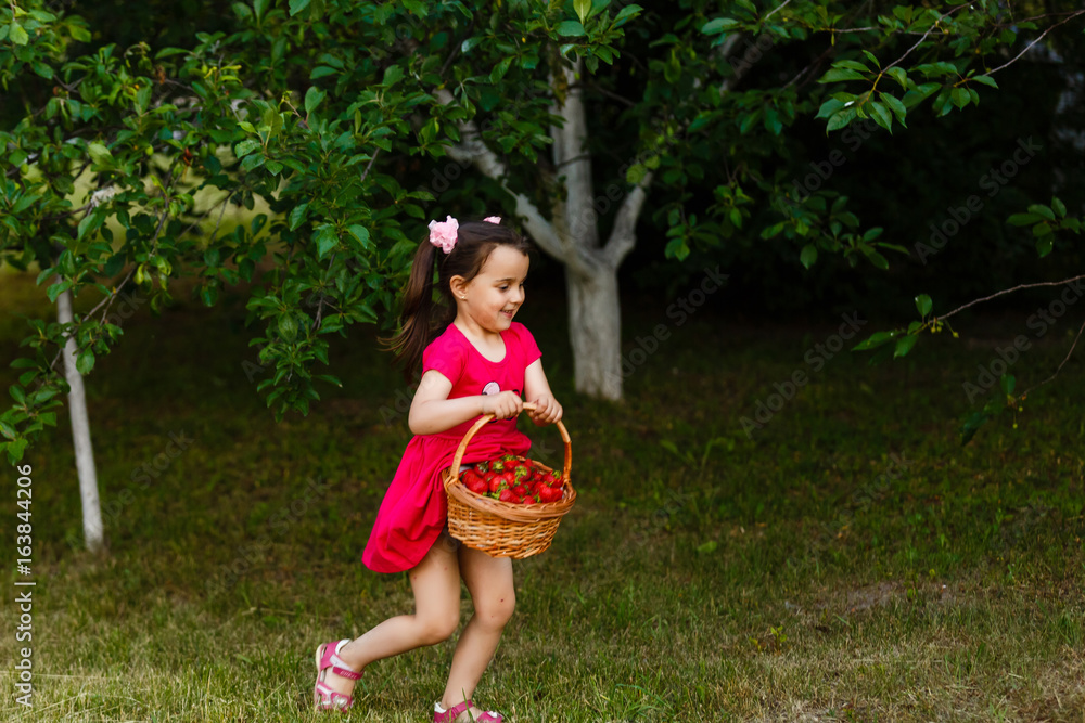Little girl is carrying a basket of strawberries