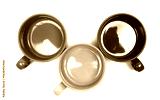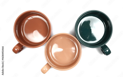 Group colorful coffee mugs isolated on white background, top view