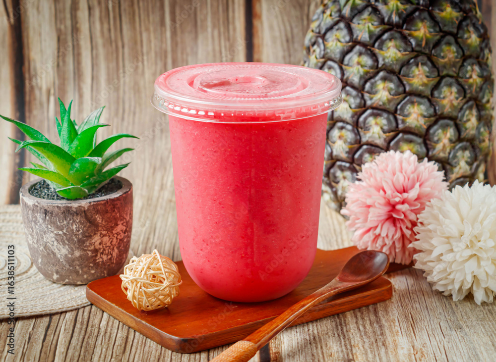 Refreshing Cranberry Banana Pineapple Smoothie in Plastic Cup with Tropical Fruits on Wooden Background Side View