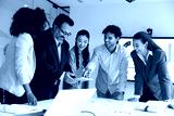Business bonding for successful teamwork. Joyful international team young financial analysts mature ceo leader work on group project using digital fintech tools in positive collaborative environment