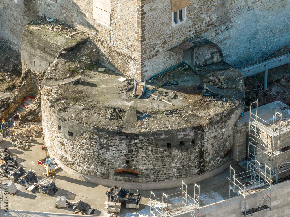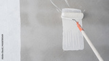 Rolling paintbrush paint white color on clean cement wall room interior background, Roller tool renovation decor construction building house professional painter