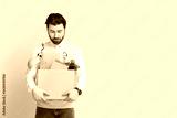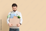 Fired young man holding box with personal stuff on beige background