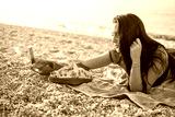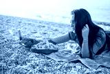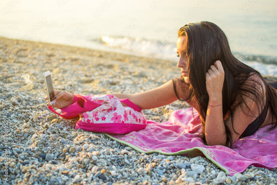Young woman taking a selfie on mobile phone. Positive young woman wearing bikini lying on blanket with smartphone.