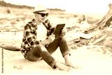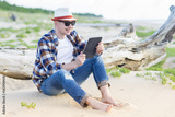 A man in smart casual hipster style with tablet combining work with relax on the beach of Baltic Sea