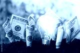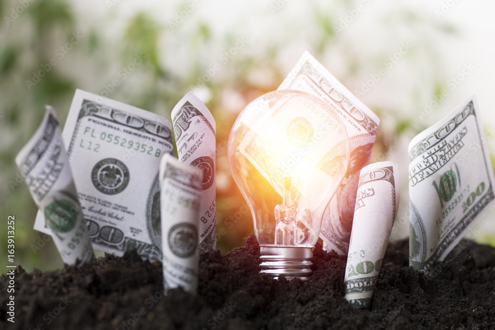 Dollars bill growth up and light bulb on soil, planting money, saving and investment, concept as invest about business and success in finance, capital banking and economy
