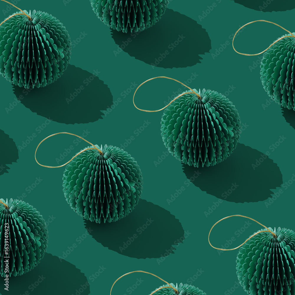 Paper Christmas Ornaments, hanging green New Year decorations as round balls. Minimal aesthetic holidays pattern, green monochrome design, repeated arrangement, top view of craft winter xmas bauble
