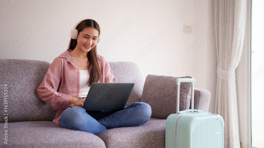 Asian adult woman plans travel adventure getaway laptop headphones sofa home comfortable remote work digital nomad lifestyle prepares vacation journey